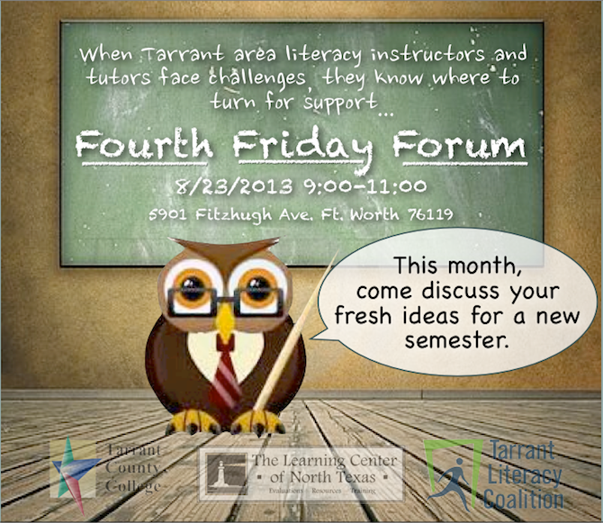 August 23rd we will be hosting back to school themed round table discussions on a variety of programmatic topics including volunteers, student motivation and retention, goal setting and achievement, the new GED, tracking and measuring progress through informal assessment, along with other back to school topics. Get excited about going back to school with lots of great door prizes. Please join us at the TCC-Opportunity Center at 5901 Fitzhugh Ave., Fort Worth 76119 from 9-11 A.M.