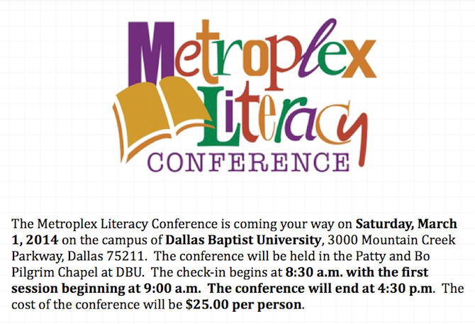 The Metroplex Literacy Conference is coming your way on Saturday, March 1, 2014 on the campus of Dallas Baptist University, 3000 Mountain Creek Parkway, Dallas 75211. The conference will be held in the Patty and Bo Pilgrim Chapel at DBU. The check-in begins at 8:30 a.m. with the first session beginning at 9:00 a.m. The conference will end at 4:30 p.m. The cost of the conference is $25.00 per person.