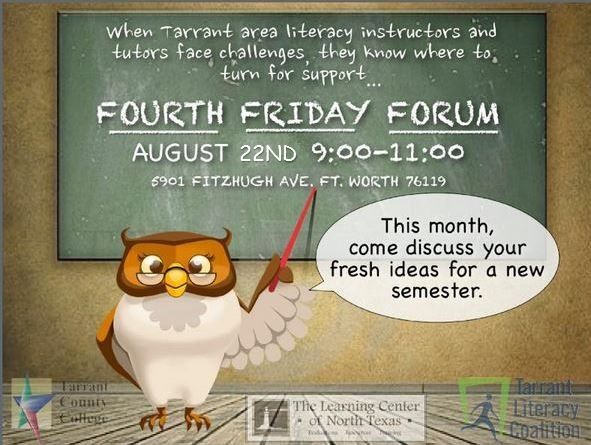 There have been so many great events this summer for Adult Education and Literacy, from our own Fourth Friday forums to the upcoming Literacy Texas Conference, that we are sure that you have lots of ideas for the new semester of teaching! At this month's Fourth Friday training event, "Fall" Back into Literacy, we would like to invite you to network and exchange ideas with other providers and volunteers who are interested in adult literacy.