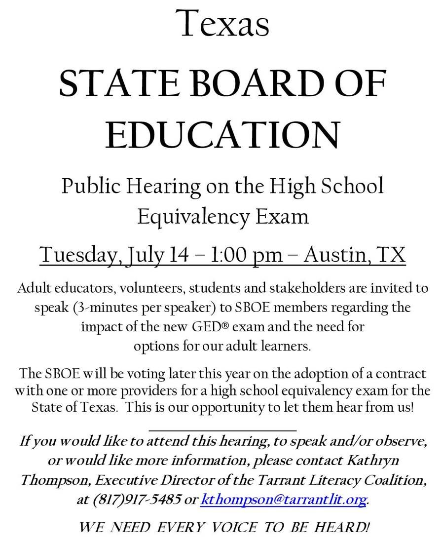 The SBOE will be voting later this year on the adoption of a contract with one or more providers for a high school equivalency exam for the State of Texas. This is our opportunity to let them hear from us!